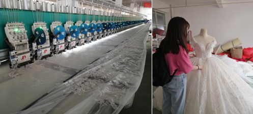团队成员走访了多家婚纱生产企业,与企业负责人和员工开展广泛交流,了解婚纱生产的原料采购、制作流程、生产工艺以及企业发展困难等情况,并主动参与婚纱整理等生产活动。