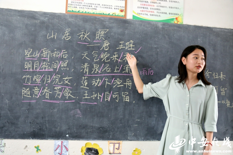 中安在线、中安新闻客户端讯:“空山新雨后,天气晚来秋。小朋友们,你们哪位知道这句话的意思?”7月15日,在池州市东至县泥溪镇中心公司朱村小学内,伟德国际victor1946汉语言文学19级员工江冰清向课堂里的孩子们问道。