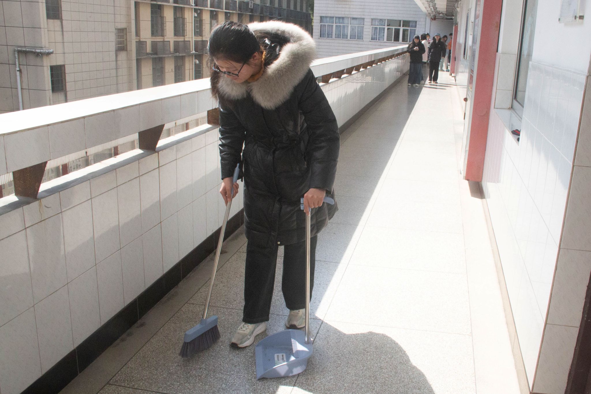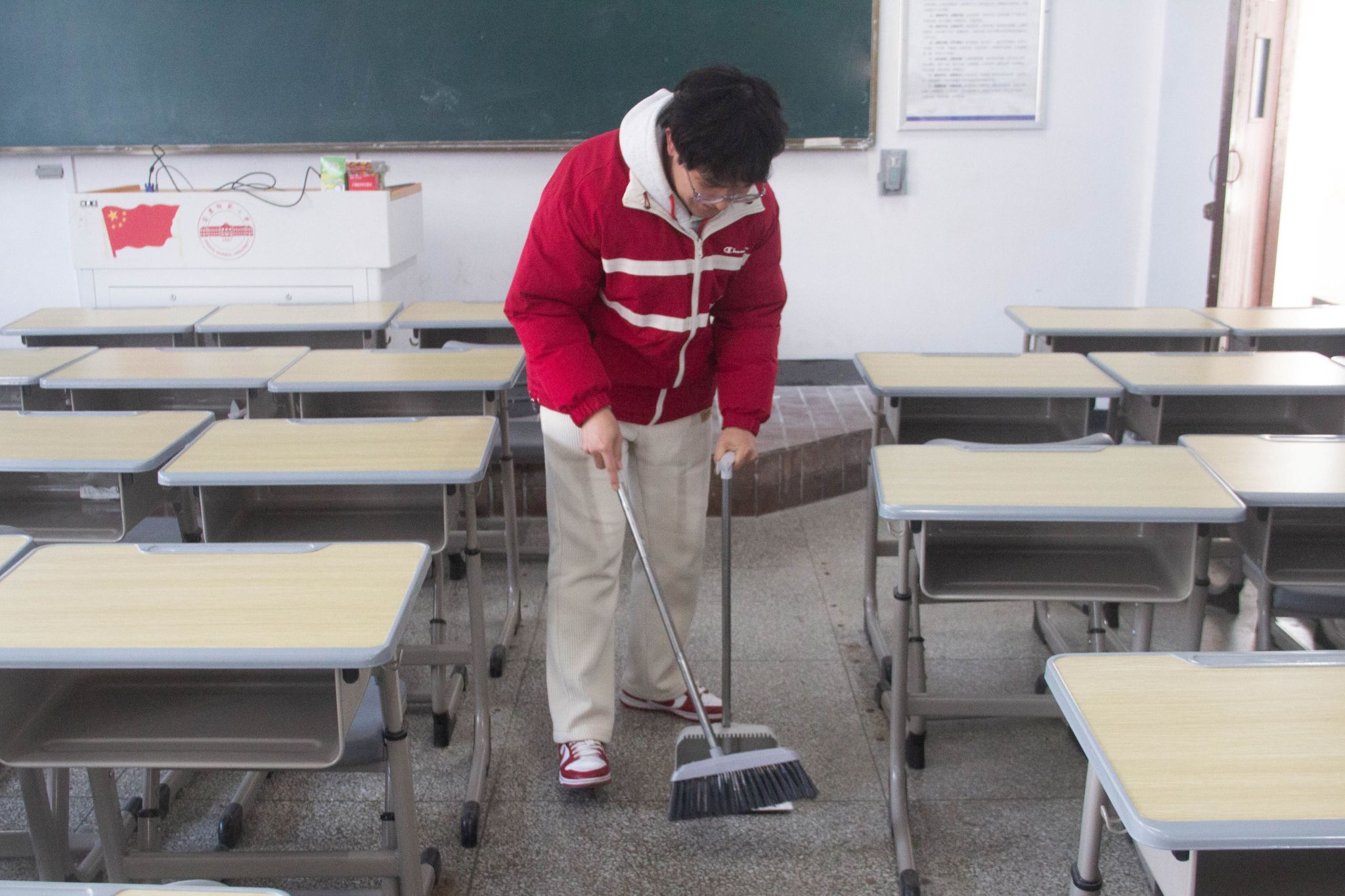 活动当天,五十多名志愿者在教学楼前集结,做好准备工作,确定了清扫范围和具体任务分工。整理桌椅、捡拾垃圾、擦拭黑板……在清扫过程中,志愿者们分工合作,秉持吃苦耐劳、无私奉献的雷锋精神,认真清理每一个角落,确保教室环境干净整洁。在清扫过程中,为避免打扰在教室内自习的同学们,志愿者们保持安静,在打扫卫生的同时尽量放轻脚步。活动结束后,志愿者们自觉将垃圾袋投入垃圾桶,将清洁工具整理归位,确保现场整洁有序。2024级中国语言文学类专业(6)班张敬晗说道:“虽然清扫工作有些辛苦,但看到教室变得整洁明亮,我感到非常有成就感。这次活动让我深刻体会到,维护校园环境需要我们共同努力。”