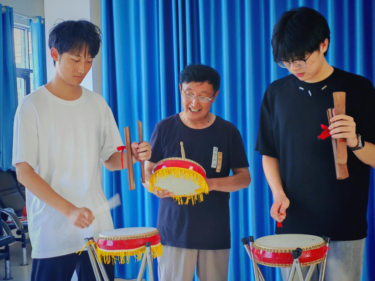 交流中,岳西鼓书代表性传承人刘纯松向团队成员分享了个人从艺经历、讲述近代优秀鼓书艺人们的故事,细致讲解了鼓书演唱的七种唱腔技巧,并现场进行示范演唱。刘纯松的生动展示与深入讲解,让实践团成员们直观感受到了岳西鼓书独特的艺术感染力。在刘纯松的指导下,实践团成员们跃跃欲试,尝试学习简单的鼓点节奏和唱段。