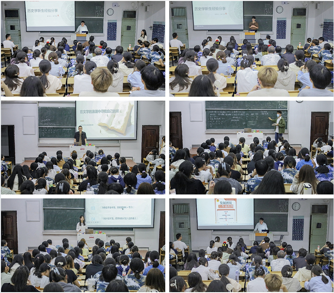 2023级汉语言文学专业文典班宣昕以“在文学浪潮中寻找自己的岸”开篇,鼓励新生坚守人文初心;2023级汉语言文学(6)班符荷苗以“追寻心中的光”为主题,用“大学是人生‘成长暑假’”比喻,引导新生接纳节奏差异、享受探索;2023级汉语言文学(8)班程子俊结合个人参加创新创业及学科竞赛经历,分享了备赛技巧;2023级历史学(3)班冯海诺讲解了师范生技能大赛的意义、备赛方法与资源获取途径;2023级历史学(3)班秦广恒分享了专业核心课程推荐书单;2023级历史学(1)班朱志伟介绍了入党流程,为有入党意愿的新生指引方向。