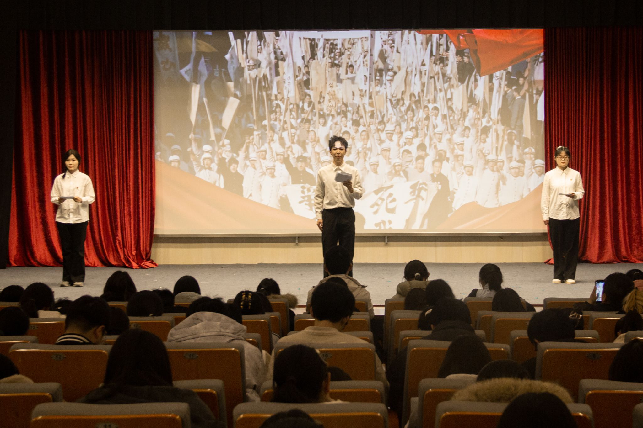《乌斯浑河的记忆》则以“八女投江”的革命故事为蓝本,通过艺术化改编,诠释了烽火岁月中女性革命者宁死不屈的民族气节。“看着孩子们背着书包笑着上学,我们就知道当年的选择没有错”这句满含期许的台词响起,两位宣讲员并肩而立、目光坚定,仿佛将八位女战士视死如归、携手投江的壮烈场景重现眼前。现场学子纷纷挺直脊背,眼神中满是崇敬与动容,深切感受到革命先辈为和平付出的沉重代价。