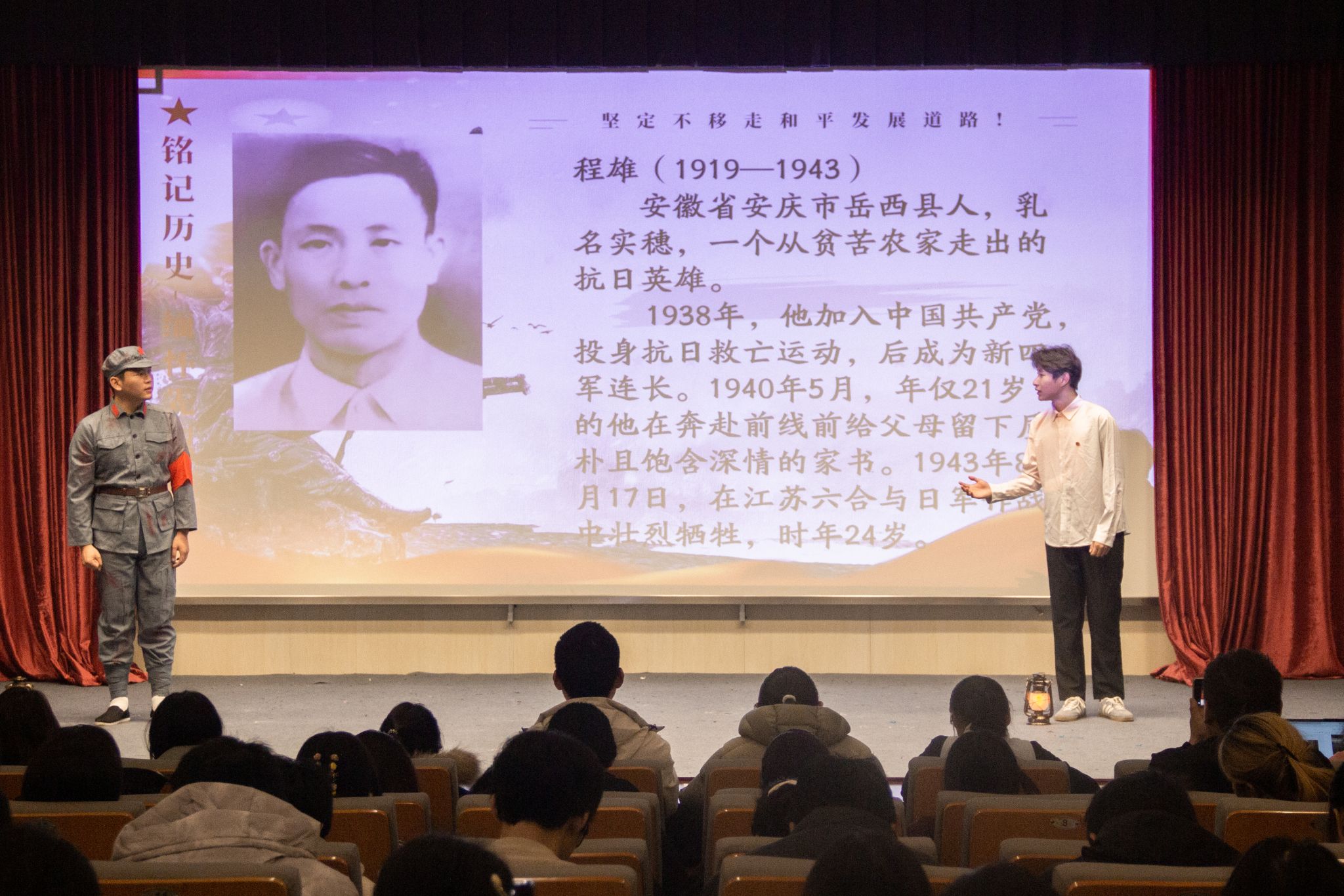 宣讲伊始,宋文希、叶凡、胡星宇三位宣讲员率先登场,以《八秩铭记抗战魂,携手共筑和平梦》为题拉开序幕。她们紧扣“八十载岁月变迁,不变的是对和平的追求”主旨,凭借翔实的史料支撑与饱含深情的讲述,再现了杨靖宇食草坚守、张自忠以身殉国、狼牙山五壮士跳崖明志等英烈事迹。沉稳坚定的语调、真挚动人的情感,让在场学子深切感悟到革命志士的家国担当。