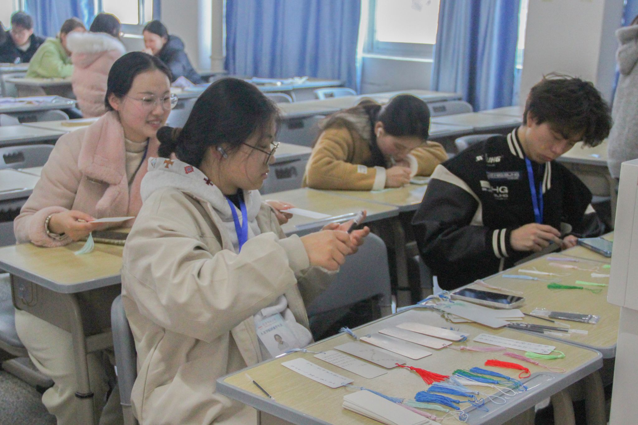 活动当天,志愿者们布置好场地,整齐摆放着空白流苏书签以及书写、绘画工具。前来参与的同学络绎不绝,在创作环节,同学们围绕雷锋事迹、经典语录以及自身对雷锋精神的体悟展开构思。有的同学以细腻的笔触勾勒出雷锋助人为乐的经典场景,有的用工整的字迹抄下“人的生命是有限的,可是为人民服务是无限的”等名言,有的则结合亲身参与的志愿服务经历,写下自己对雷锋精神的理解与感悟。创作过程中,大家不时相互交流,分享自己的设计灵感和书写内容。