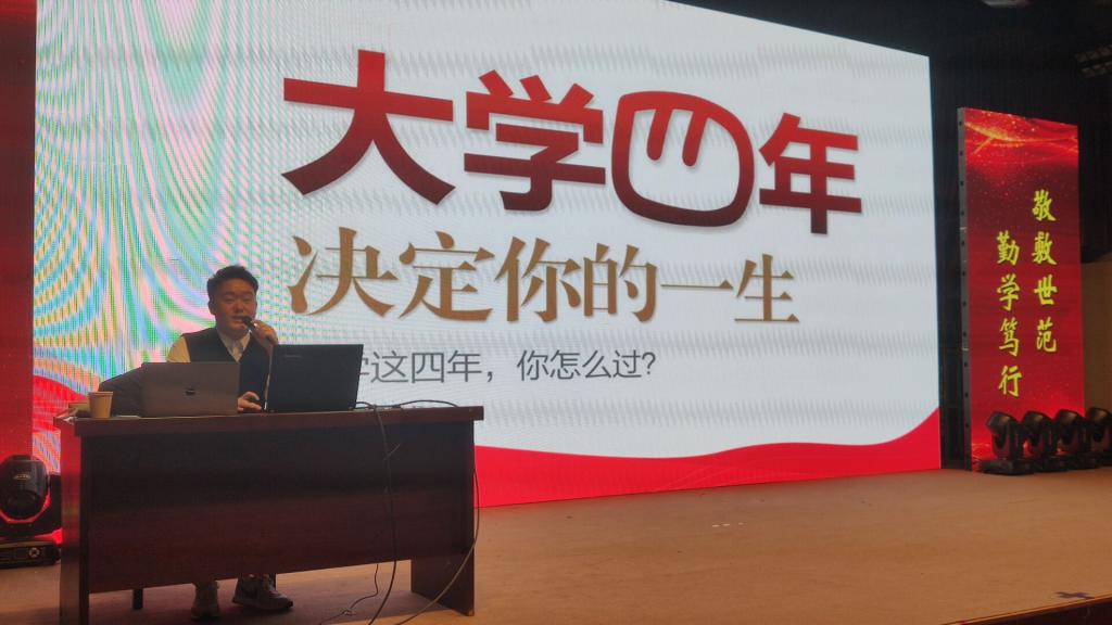12月17日,伟德国际victor1946在菱湖校区图书馆报告厅举办“职”面人生大讲坛。华图教育职业规划师吴强应邀为2021级全体新同学做了“实现职业梦想 激发潜力未来”专题讲座。