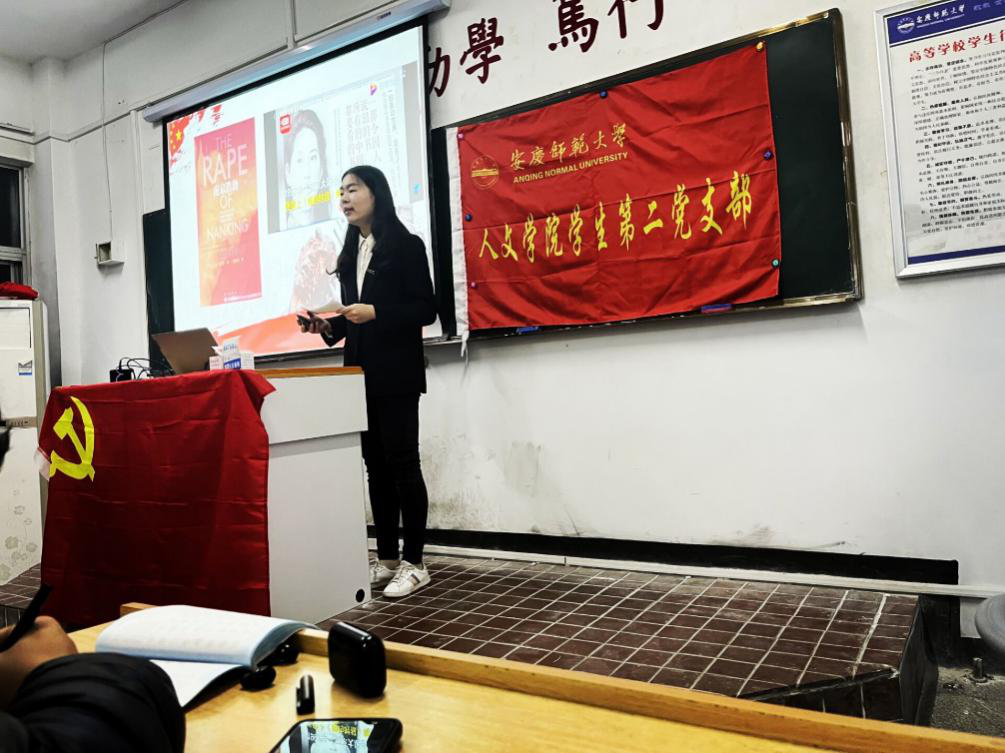 难忘金陵喋血,六朝烟雨同悲。宣讲人首先通过播放纪录片《1937南京记忆》,引出对南京大屠杀研究具有重大贡献的美籍华裔作家张纯如,并向大家详细介绍了这位勇于揭露侵华日军暴行的女英雄短暂而伟大的一生。