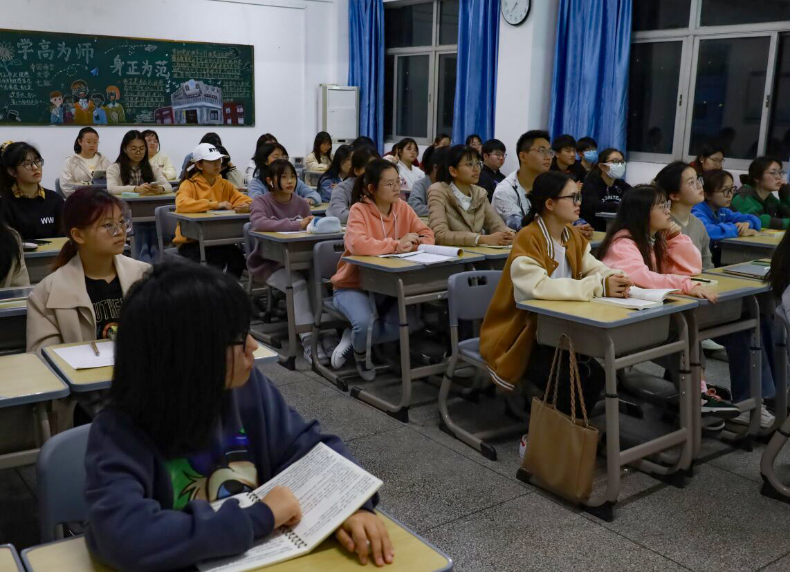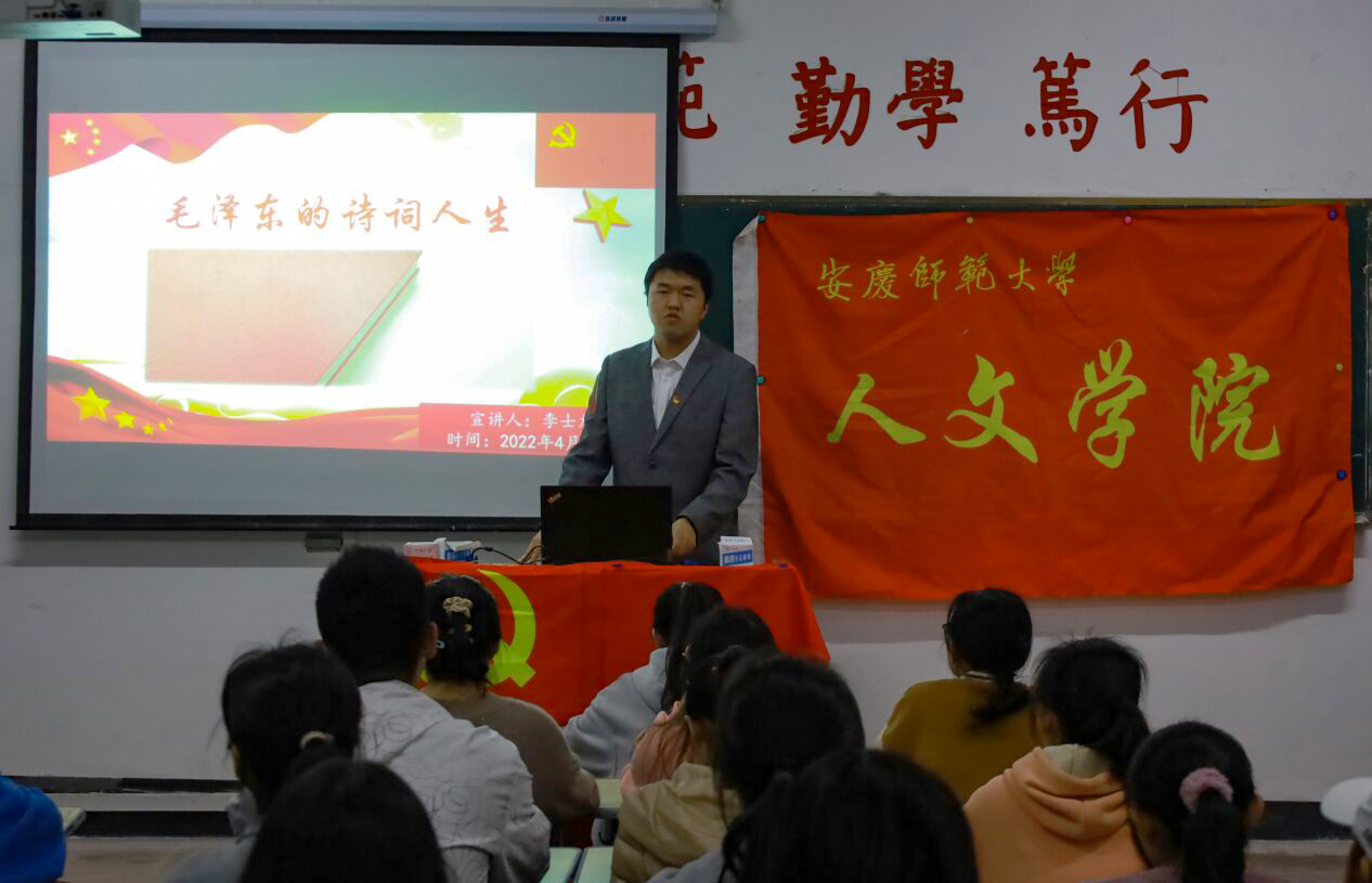 宣讲人汉语言文学专业2019(4)班的李士龙则以毛泽东的诗词为切入点,立足于“青年立志”、“中年忆情”、“晚年思史”三个阶段,聚焦了毛泽东的思想成熟历程和党的发展、壮大之路,在抑扬顿挫、情绪饱满的声调中,那段红色历史被娓娓道来。