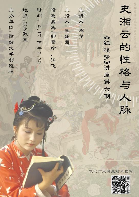 “史湘云的‘真’也体现在‘赤子之心’,同学们需要学习她性格中的‘坚韧洒脱’。此外,在阅读经典时,大家应该抱有做学问的态度,多与他人探讨,不能害怕沟通。”讲座最后,敬敷文学创造社指导教师江飞就员工们的学习方法提出了一些建议。同时,他还提及社团的后续发展会不断丰富讲座形式,争取让员工们可以“登台亮相”,主动分享心得和阅读体会,和老师、嘉宾们一起进行探究性学习。(文/员工记者 虞欣 韩菲旸 图/员工记者 魏文婷 刘菁 审核:王波)
