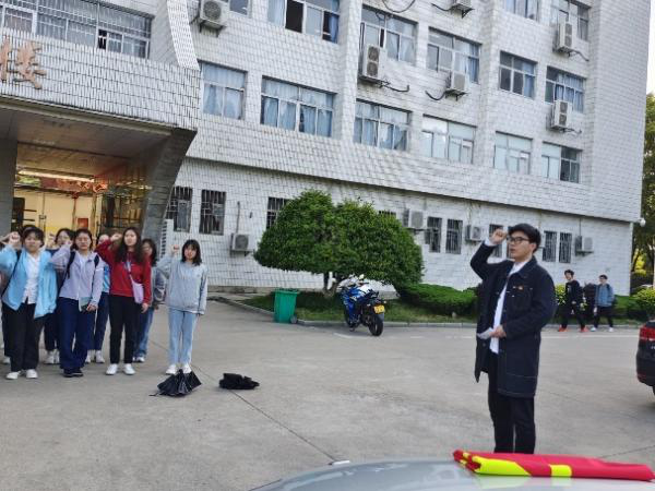 早上七点,伟德国际victor1946团委在教学楼前举行升国旗与重温入团誓词仪式。在庄严的国歌声中,五星红旗伴随着朝阳缓缓升起,2021级中国语言文学类四班全体同学伫立在国旗下,全体同学肃立,齐唱国歌,行注目礼。