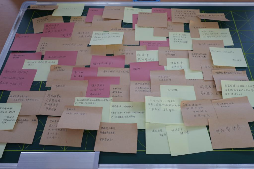活动分为知识问答、便签寄情两个环节,参与者在第一关回答完有关党史、团史和中秋节文化知识的问题后,便可获得一张明信片作为“入场券”。“欲醉欲眠欲寻月,且与今夕共团圆。”接下来的一关里,员工们要在便签上写下对家人和老师思念和祝福,并将其贴在专门的展板上。而在最后一关,参与者可从五仁馅、椒盐馅、黑芝麻馅等众多月饼中挑选一个符合自己口味的带走。