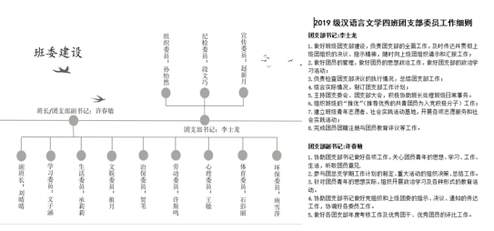 支部设书记、副书记、纪检委员、组织委员、宣传委员各1人。团干配备齐全,分工明确,各司其职,运转有序。支部委员认真完成各项基本团务工作,充分利用智慧团建,整理、保管所有团组织生活的相关资料,对各项工作实行目标化管理,年初做好计划,年底做好总结汇报,责任落实到人。