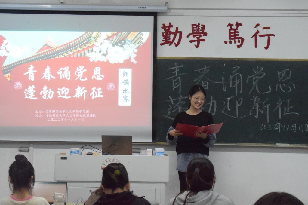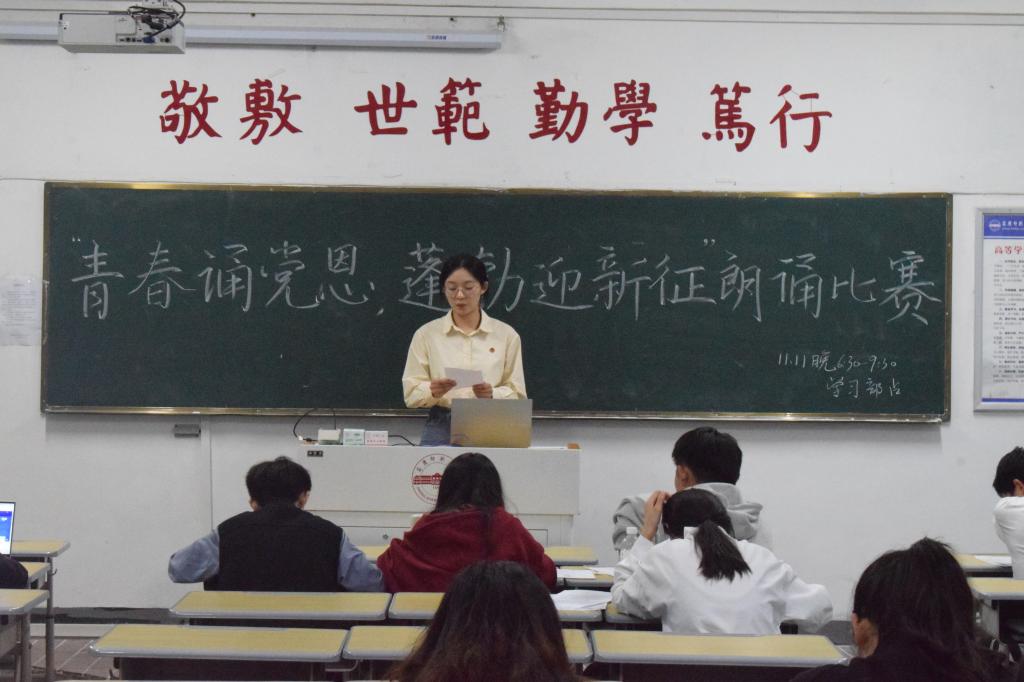 本次比赛以“青春诵党恩,蓬勃迎新征”为主题,选手们通过独诵的方式,借助音乐、服装等灵活多样的道具,现场展现与党和祖国相关的诵读内容,评委进行现场评分。