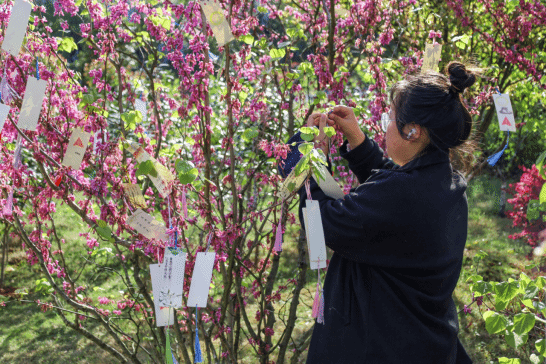 “一张书签寄哀思,缅怀英烈不朽功绩。”在烈士墓旁的小径上,员工们领取陵园提供的特色书签,写下对革命烈士们的寄语,悬挂在径边树梢上,形成一道独特的风景。同学们纷纷表示,采用书签寄语的方式追忆革命先驱,不仅形式新颖,而且还大家搭建了直接表达情感的平台。
