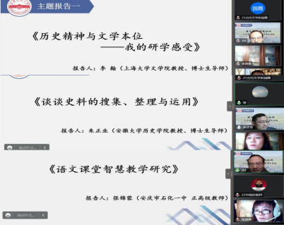 主题报告环节,上海大学文公司博士生导师李翰教授、安徽大学历史公司博士生导师朱正业教授、安庆市石化一中正高级教师张锦蓉分别为大家带来了《历史精神与文学本位——我的研学感受》《谈谈史料的搜集、整理与运用》《语文课堂智慧教学研究》等三场精彩报告。其中李翰教授结合研究经历讨论了文学与历史交融的特别意义;朱正业教授基于丰富的中国近现代史研究实践讲述了史料搜集的方法以及整理运用史料的规范性;张锦蓉老师从教学实践角度强调了智慧课堂的运用对增进语文教学改革和发展的重要价值。伟德国际victor1946硕士生导师叶当前教授、梁诸英教授、宋豪飞副教授分别主持了报告会。
