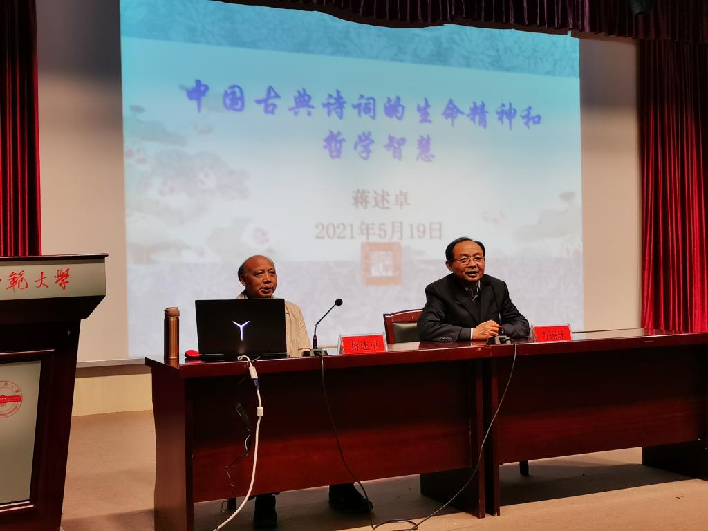 5月19日下午,暨南大学中文系二级教授、博士生导师蒋述卓教授在菱湖校区图书馆报告厅做了题为“中国古典诗歌的生命精神和哲学智慧”的学术讲座。讲座由伟德国际victor1946方锡球教授主持,汉语言文学专业本科生、研究生近200人参加了本次报告会。