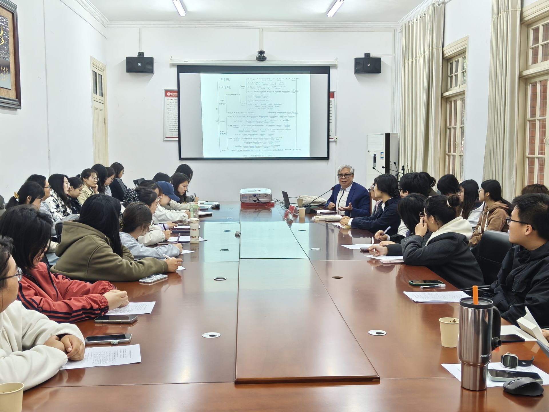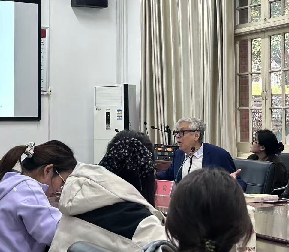 王寅教授围绕新文科教研目标、语言本质、学教方法及科研创新展开阐释。他指出,新文科建设要求语言学弥补哲学基础薄弱的“学术空缺”,体认语言学(ECL)作为前沿理论,以“现实—认知—语言”为核心,融合多元思想,强调语言的体认性与人文性,已拓展出21个分支学科。在研究实践中,该理论倡导“理论建构+封闭语料库”的科研模式,通过解说词翻译、菜名命名等案例验证了理论解释力。同时,王寅教授分享了“厚积薄发”的学习之道与“梳理启发”的教学方法,强调科研需“立论新、论据足”。现场师生就学位论文写作、理论实践应用等问题进行深入交流,氛围热烈。