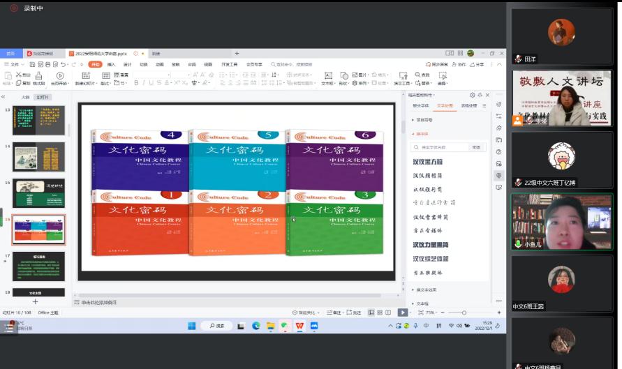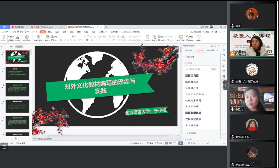12月1日下午14时,敬敷人文讲坛第二十六讲顺利举行,北京语言大学文公司教授、博士生导师于小植应伟德国际victor1946邀请作了题为“文化教材编写的理念与实践”的线上讲座。本次讲座由张瑾博士主持,李金梅副教授与谈,该院部分青年教师、研究生和汉语国际教育专业本科生共50余人参与线上交流学习。