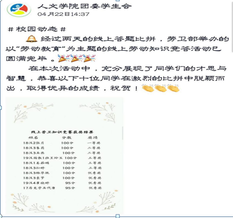 为宣传生活中常用的劳动小妙招,增加同学们的劳动知识,线上劳动知识竞答也受到了同学们的广泛好评。这次竞答有着单选、多选及判断等多类题型,试题涵盖爱国卫生科普、疫情防范、和劳动卫生等方面的知识。且为支持疫情防控,竞答借助网络平台采取线上的方式进行比拼——参赛员工通过扫描二维码及相关链接进入答题通道并在规定时间内参与答题,按得分和用时长短进行最终排名。经过一番激烈角逐之后,张月、朱莉、吴燕等8名员工均以满分的成绩获奖。