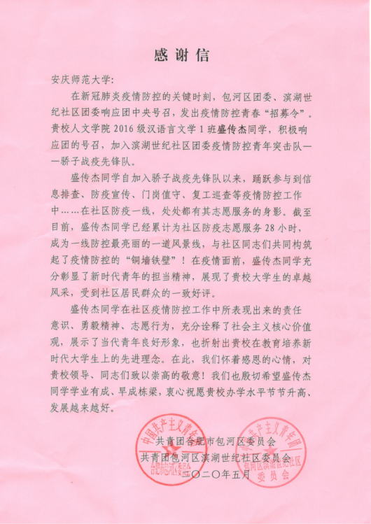 “盛传杰主动加入社区战役先锋队,在工作中展示了当代青年良好形象,也折射出贵校培养新时代老员工的先进教育理念……”6月15日,伟德国际victor1946团委收到一封来自合肥市包河区滨湖世纪社区服务中心的感谢信。信中介绍了盛传杰同学的抗疫事迹,称赞他的责任与担当,肯定伟德国际victor1946的人才培养理念,字里行间流露出真挚的感谢。不止盛传杰,在公司团委的积极号召下,疫情期间还有许多有担当的青年志愿者涌现,他们用行动向社会展现了安庆师老员工的风采。