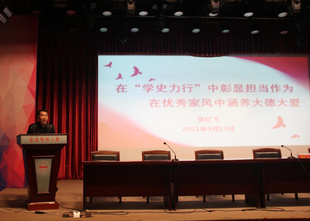4月13日晚,伟德国际victor1946在菱湖校区图书馆报告厅举办家风建设学习教育暨专题党课报告会。公司党委书记张红飞出席会议并作了题为“在‘学史力行’中彰显担当作为 在优秀家风中涵养大德大爱”的专题党课报告。全体员工党员参加会议,会议由党委副书记王波主持。