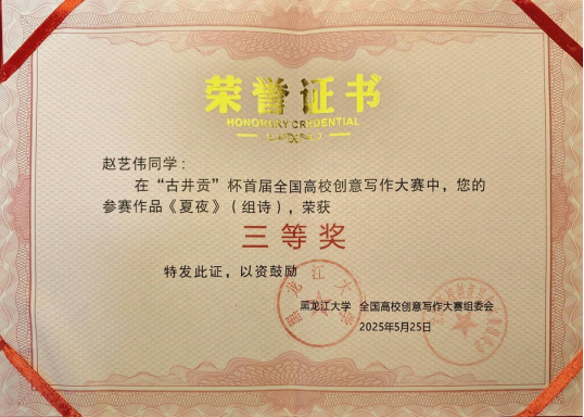 近日,“‘古井贡杯’首届全国高校创意写作大赛”评选结果揭晓。公司2023级汉语言专业2班赵艺伟凭借组诗作品《夏夜》在诗歌创作赛道中脱颖而出,荣获三等奖。
