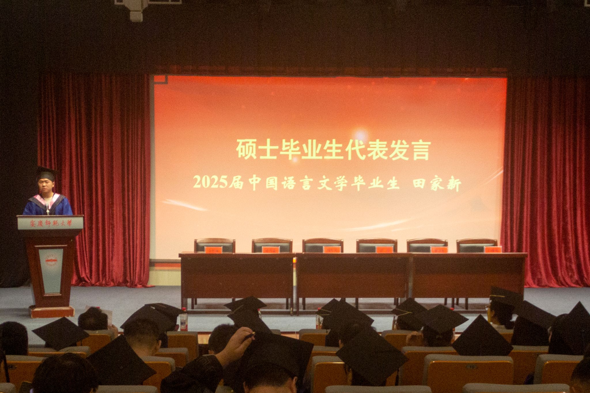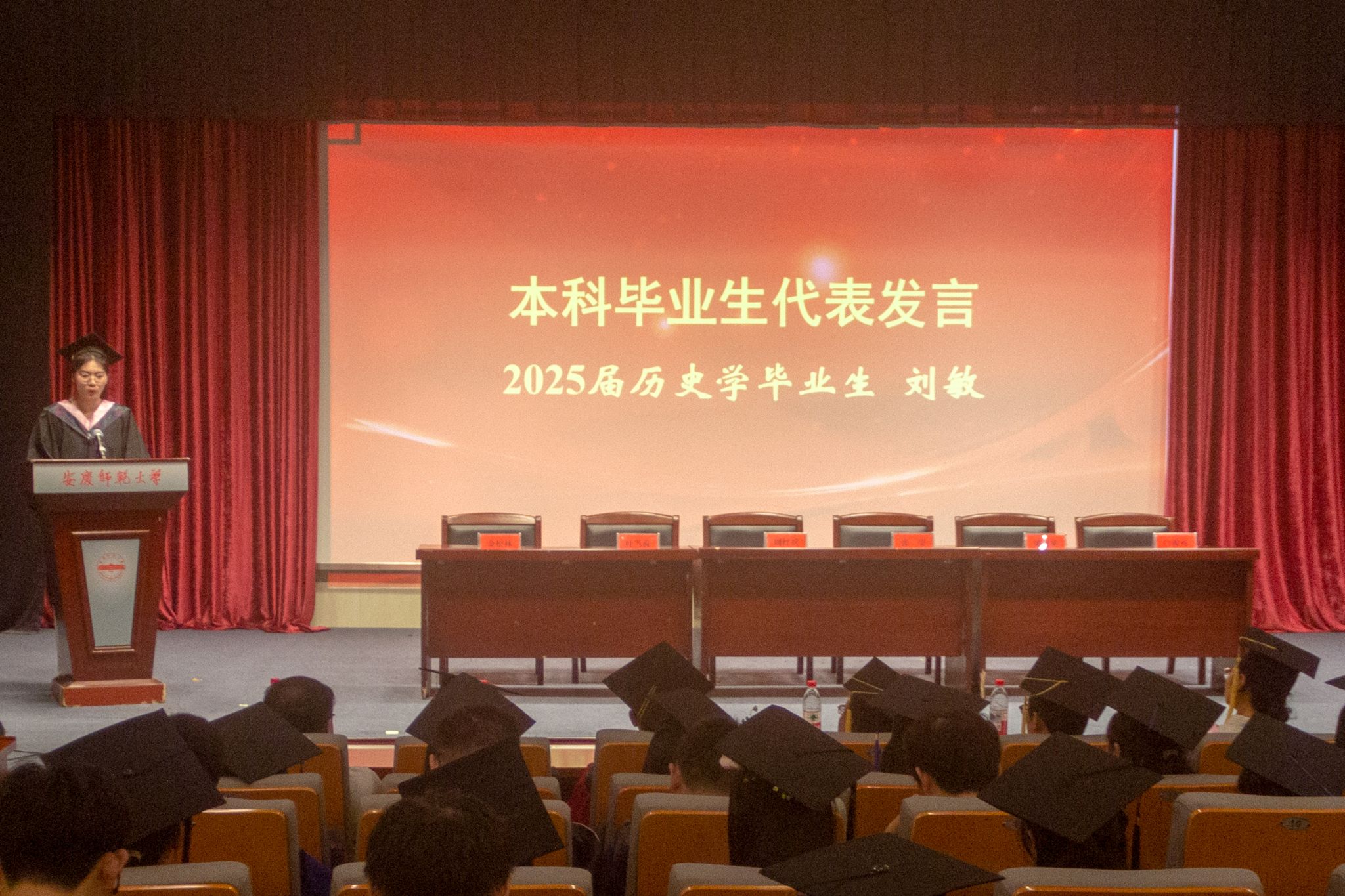 毕业生代表,2021级历史学3班刘敏分享了大学四年从青涩懵懂到矢志追梦的蜕变历程,号召同学们“在文史典籍中寻找到生命坐标”;2022 级中国语言文学硕士田家新用“五次失利仍不放弃,第六次终获成功”的成长经历,诠释了“坚定追求”的意义。