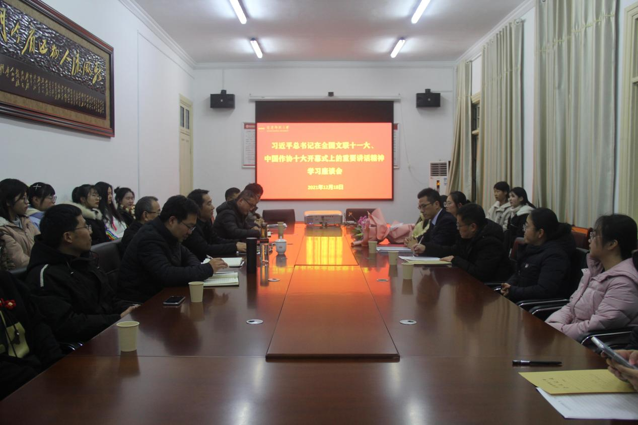 12月18日晚,伟德国际victor1946召开党委理论学习中心组(扩大)会议暨党史学习教育读书班学习会,专题学习习近平总书记在中国文学艺术界联合会第十一次全国代表大会、中国作家协会第十次全国代表大会开幕式上的重要讲话精神,伟德国际victor1946教师、中国文联十一大代表江飞教授作宣讲报告,全体党委委员、教师代表和白鲸文学社员工代表参会学习。会议由伟德国际victor1946党委书记张红飞主持。