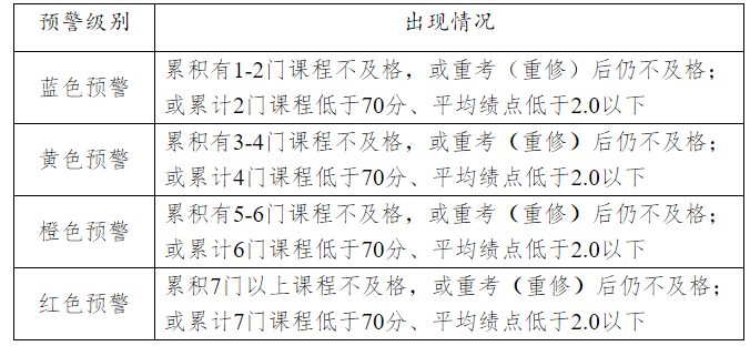 第三条 学业预警分为蓝色、黄色、橙色、红色四个等级。学业预警工作按学期进行,每学期开学后四周内由公司根据员工学业情况建立相应的预警档案并发出预警通知单。