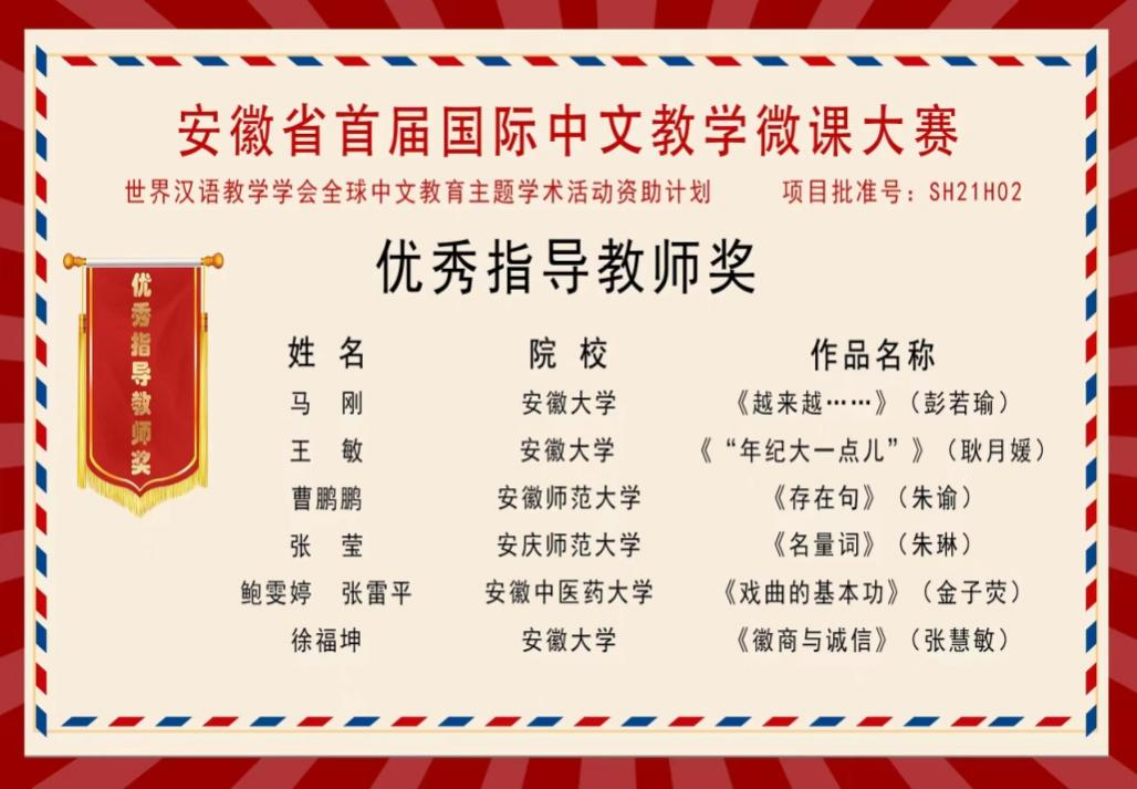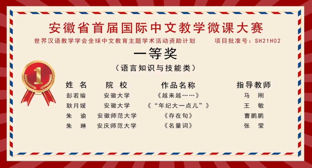 2022年11月20日,由世界汉语教学学会全球中文教育主体学术活动资助、安徽省汉语国际教育研究会主办、安徽大学文公司和安徽农业大学外国语公司承办的安徽省首届国际中文教学微课大赛评选结果揭晓。伟德国际victor19462019级汉语国际教育专业朱琳同学荣获一等奖;2019级汉语国际教育专业梁嘉越同学、朱慧同学荣获优秀奖;张莹老师荣获优秀指导教师奖。